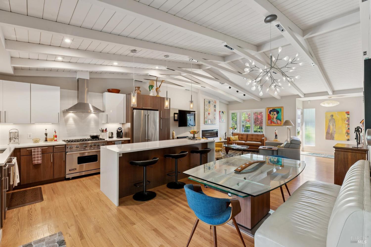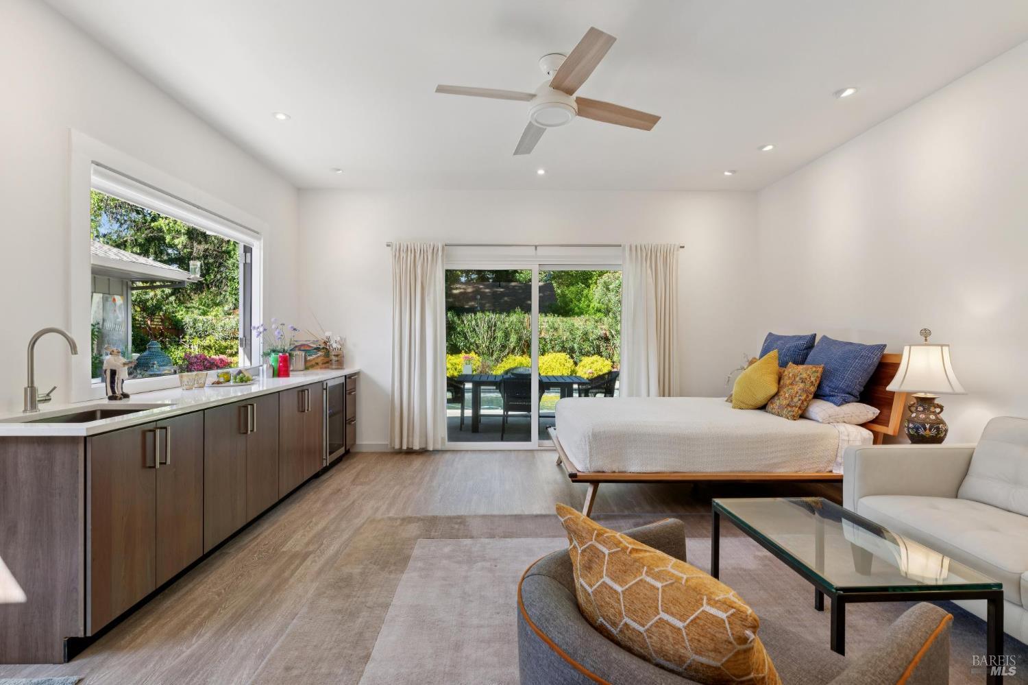Beautiful and pristine contemporary single-level home on Sonoma's coveted Eastside. The main residence offers 3 bedrooms and 3 bathrooms, plus a detached pool house/casita with a full bath for added flexibility. Vaulted wood ceilings and hardwood flooring bring warmth and a clean, modern feel throughout. The chef's kitchen includes quartz countertops, a large island, Viking 6-burner range, and Viking dishwasher. Recent upgrades include a new roof, solar, and an EV charger. The backyard is designed for easy indoor-outdoor living, featuring a heated pool, hot tub, and expansive deck ideal for dining and entertaining. Mature landscaping creates a private, relaxed setting. The pool house/casita is fully equipped, making it well-suited for guests, a home office, or additional living space. Located just a short distance to Sonoma's historic Plaza, restaurants, and wineries, this property offers a convenient Eastside location paired with a comfortable Wine Country lifestyle.